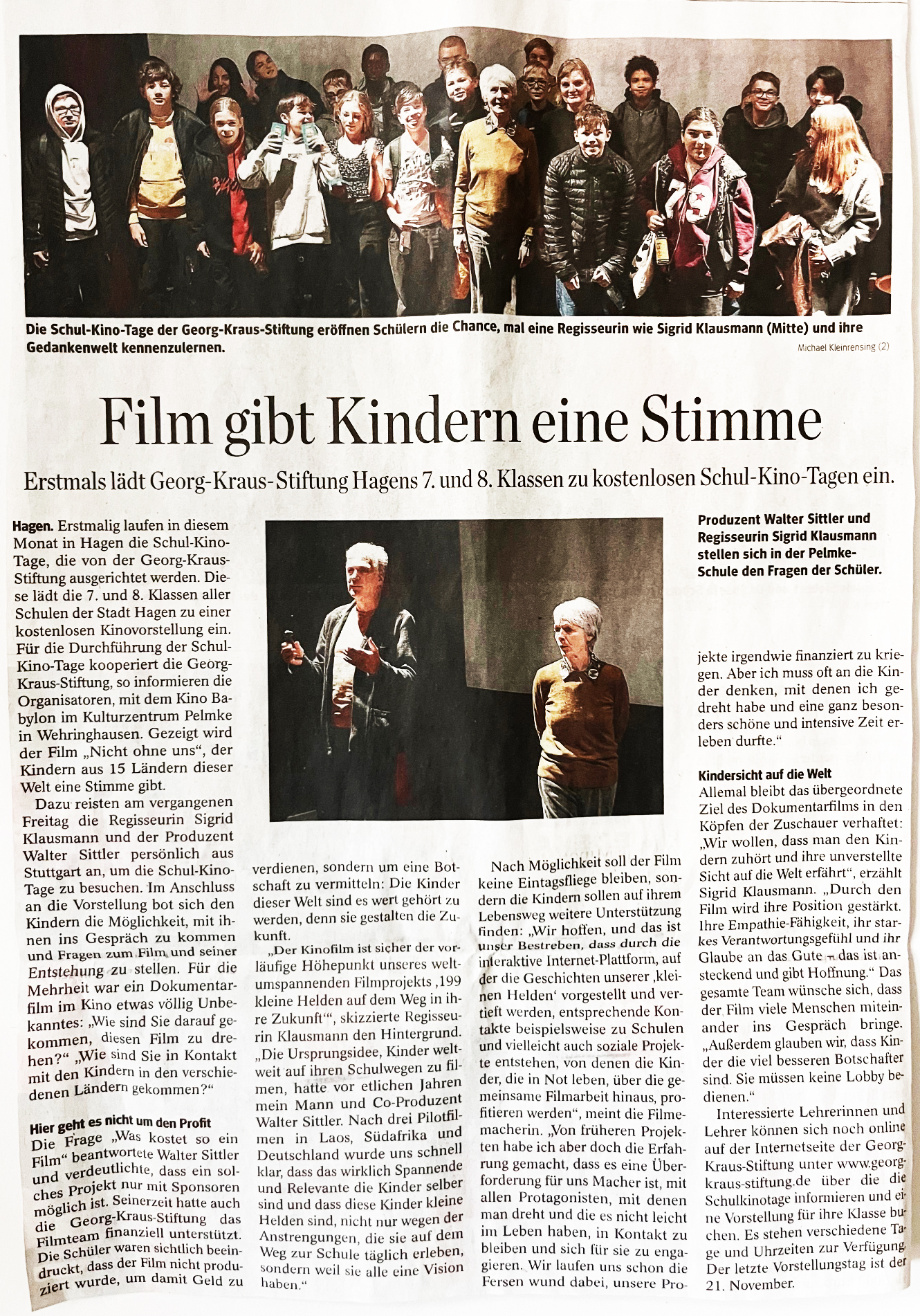 Erstmalig starten in Hagen die Schul-Kino-Tage, die von der Georg Kraus Stiftung ausgerichtet werden. Sie lädt die 7. und 8. Klassen aller Schulen der Stadt Hagen zu einer kostenlosen Kinovorstellung ein. Für die Durchführung der Schul-Kino-Tage kooperiert die Georg Kraus Stiftung mit dem Kino Babylon im Kulturzentrum Pelmke in Hagen. Gezeigt wird der Film „Nicht ohne uns“, der Kindern aus 15 Ländern dieser Welt eine Stimme gibt. Am Freitag, dem 07.11.2025 reisten die Regisseurin Sigrid Klausmann und der Produzent Walter Sittler persönlich aus Stuttgart an,